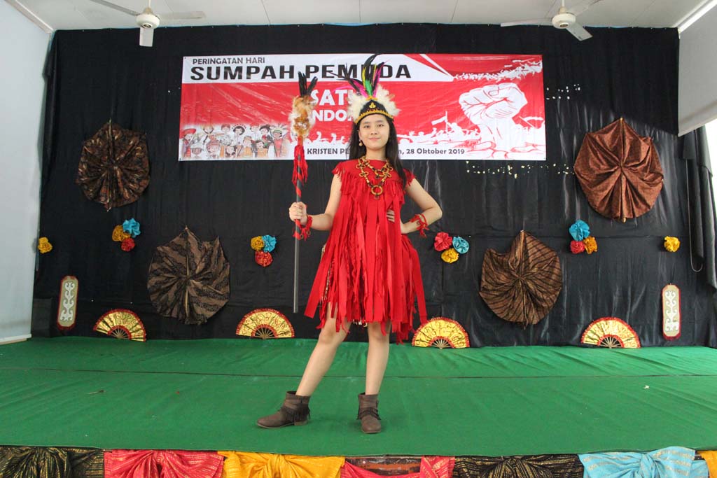 O iya, ada yang menarik loh pada peringatan kali ini. Para siswa/ i beserta guru dan karyawan SD Kristen Petra 10 mengenakan baju daerah. Wah, berbagai macam adat dan budaya terlihat dari kostum yang dikenakan. Kami berpenampilan secara optimal. Ini menunjukkan bahwa semangat kebhinekaan sudah ada dalam diri kami sejak kecil. Peringatan yang diselenggarakan tepat tanggal 28 Oktober ini diawali dengan upacara yang dipimpin oleh Kapolsek Sukomanunggal. Dalam pidato sambutannya, beliau berpesan dan mengajak para generasi muda Indonesia harus memupuk rasa kepedulian akan negaranya sejak dini.